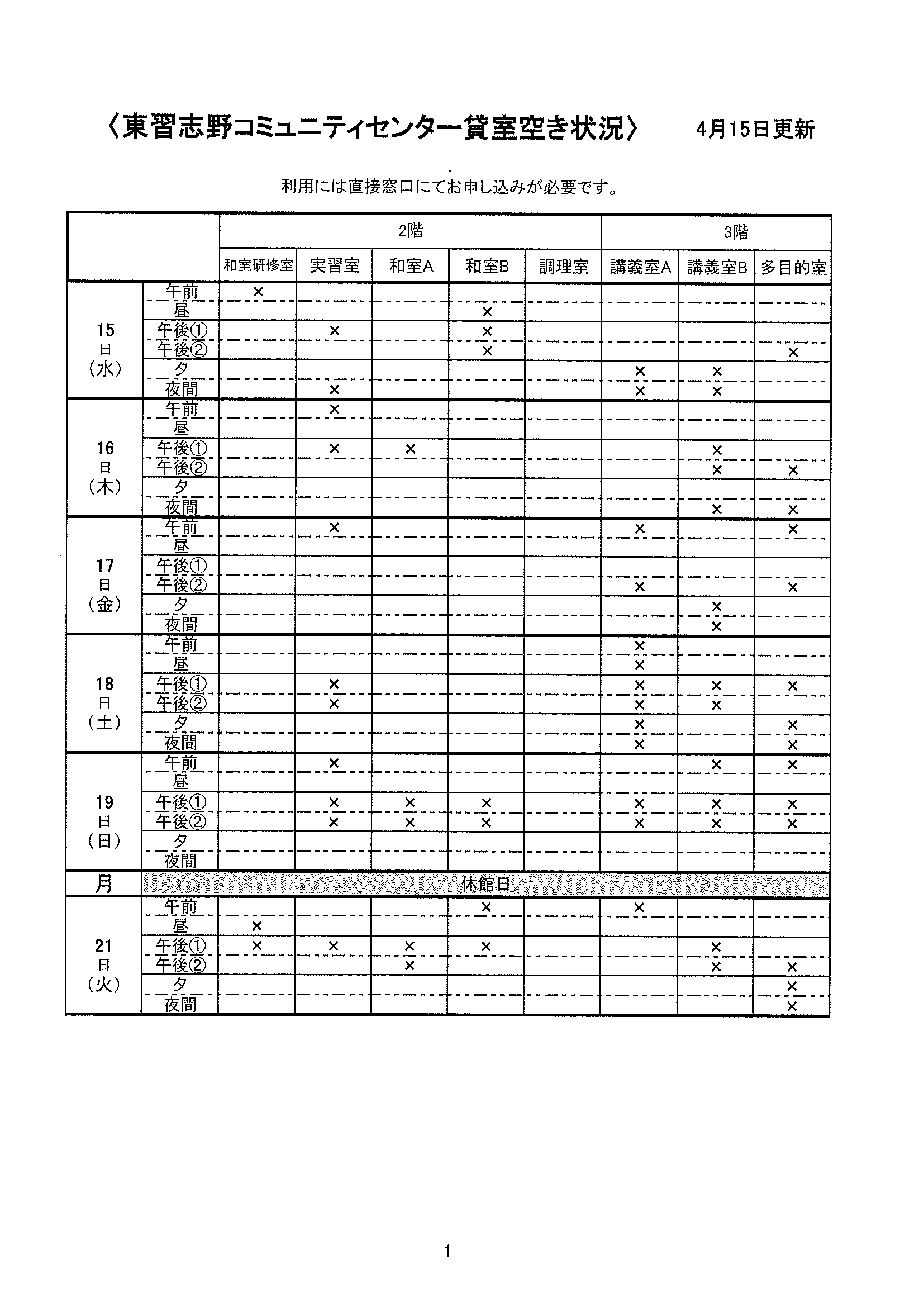 空き状況4/15~4/21