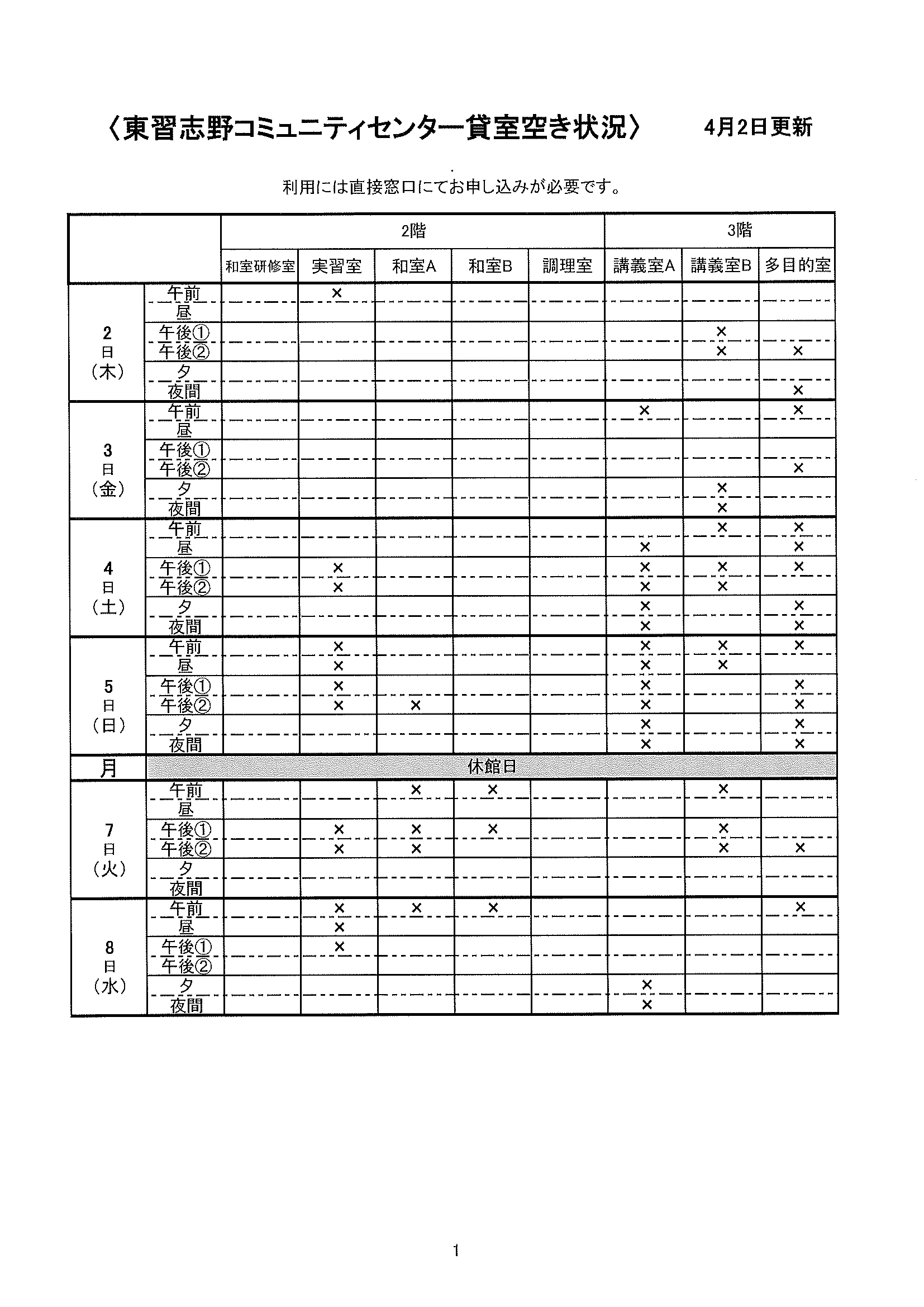 空き状況4/2~4/8
