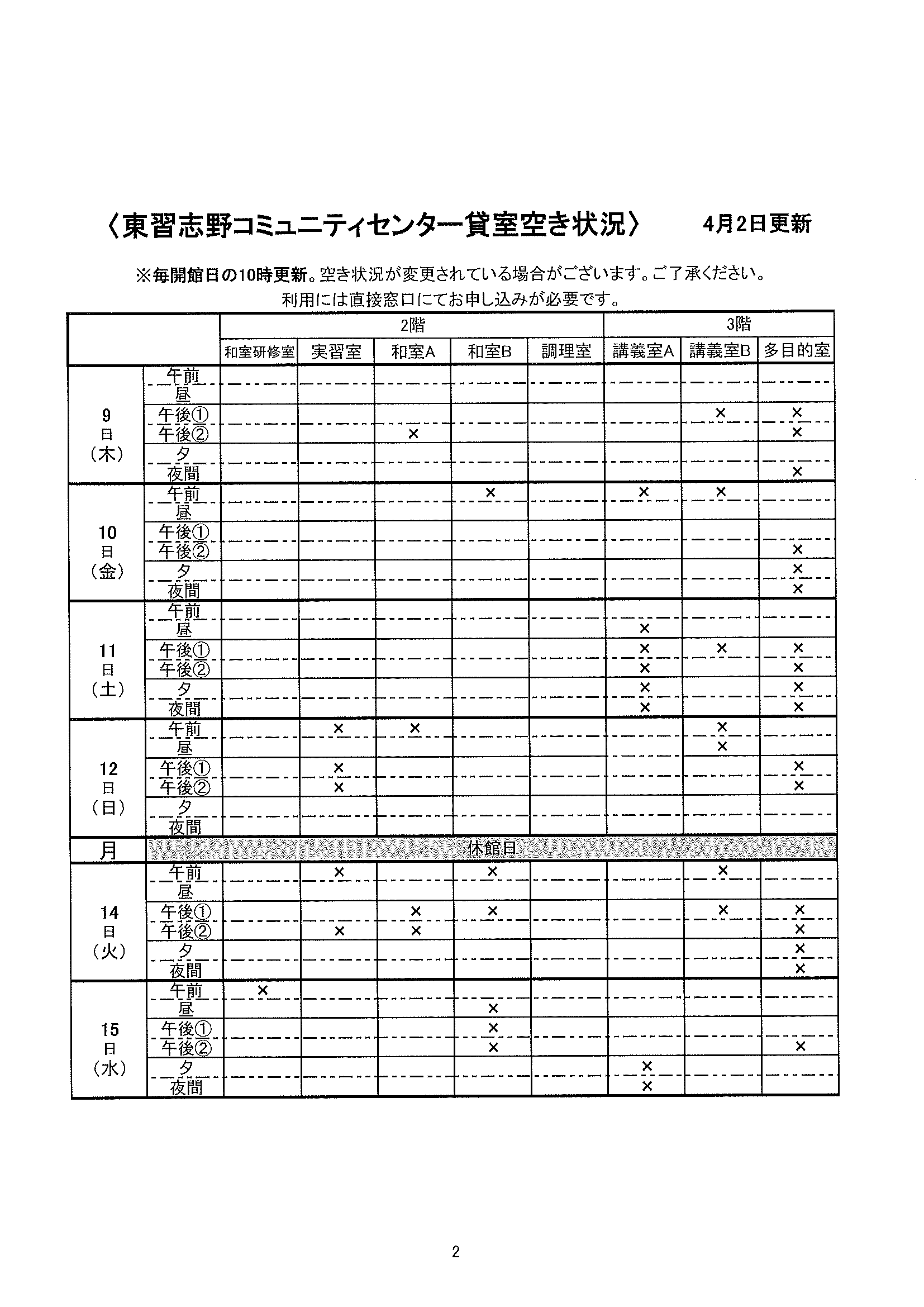 空き状況4/2~4/15