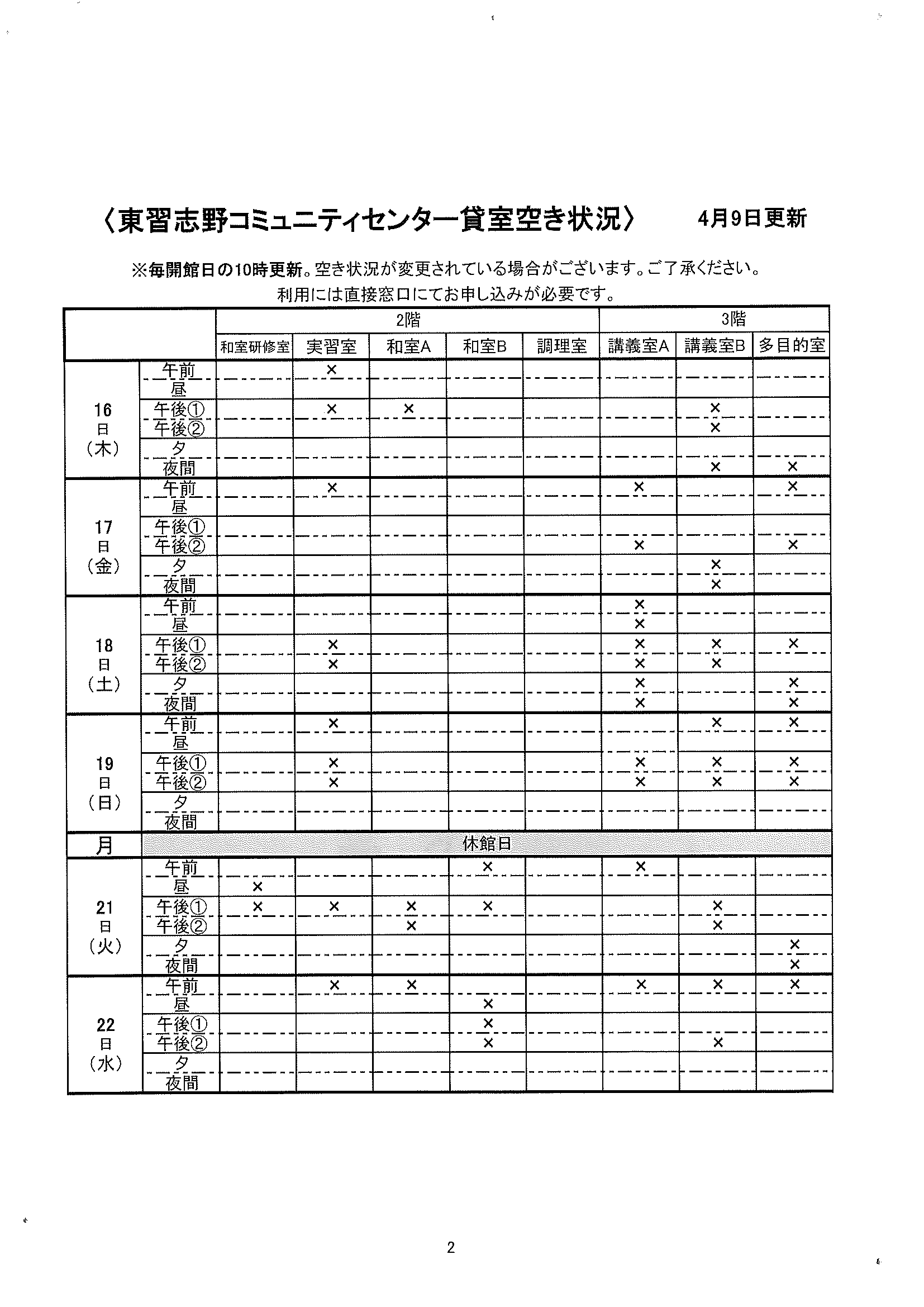 空き状況4/9~4/22