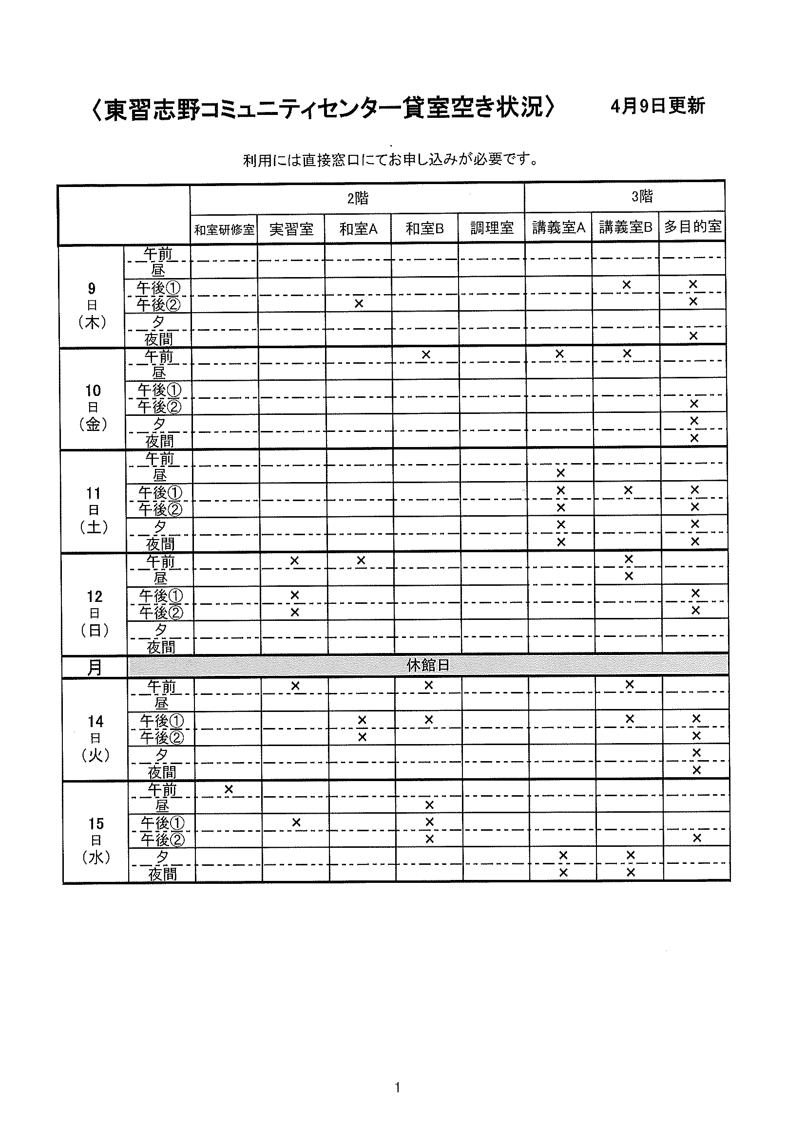 空き状況4/9~4/15