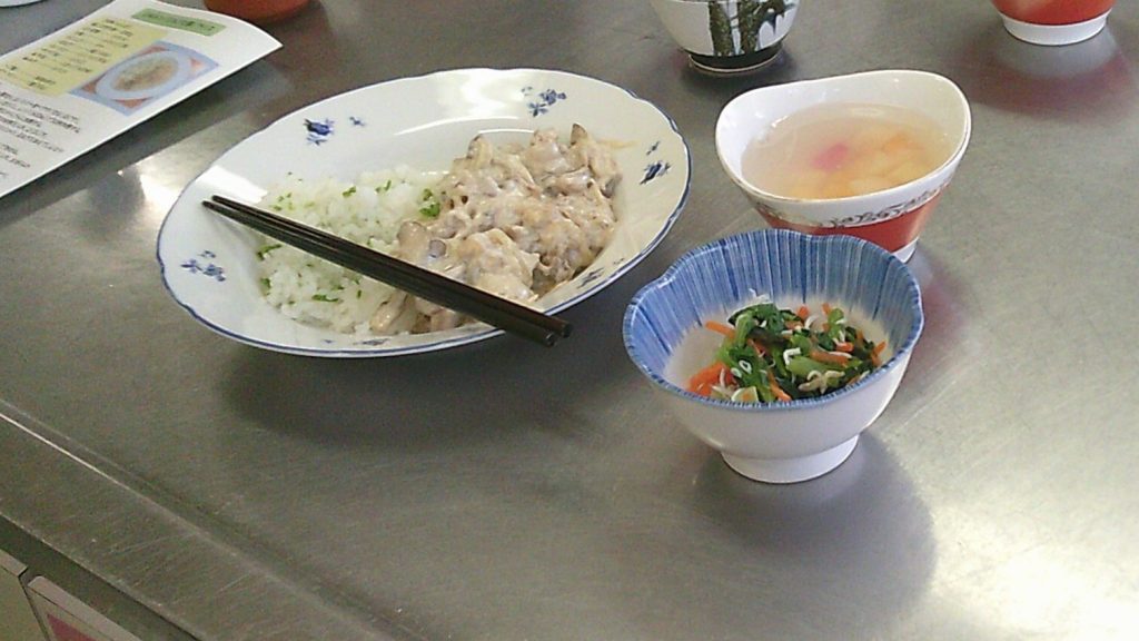 当日は、ミルトンライス、小松菜と人参のしらす和え、フルーツ寒天を調理実習でつくりました。